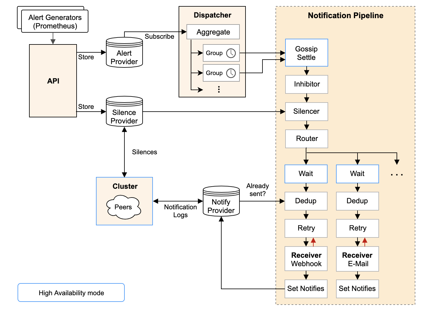 Notification Pipeline链式处理; Notification Pipeline为这组警报确定发送目标,并执行抑制逻辑,静默逻辑,去重逻辑,发送与重试逻辑,实现警报的最终投递;