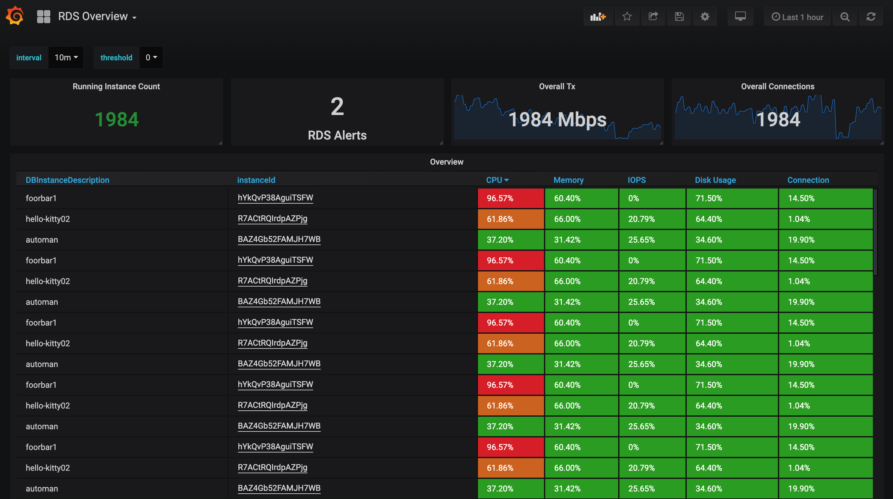 集成到 Prometheus 监控之后, 借助 PromQL 强大的表达能力和 Alertmanager, Grafana 的强大生态, 我们不仅能实现所有监控信息的整合打通, 还能获得更丰富的报警选择和更强的看板能力. 下面就是一个对 RDS 进行 TopN 查询的例子: