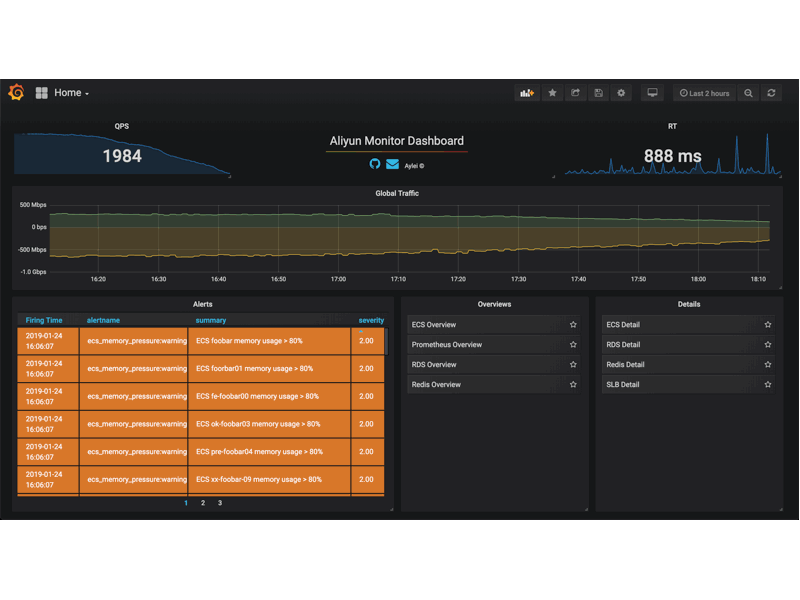 要一键拉起整套监控栈, 首先 kubernetes 就不考虑了, 能无痛部署生产级 kubernetes 集群的大佬不会需要这样的命令. 这时候, 反倒凉透的 docker-compose 是一个很好的选择. 还是以阿里云 exporter 为例, 仓库提供的 docker-compose stack 里提供了 Prometheus, aliyun-exporter, Grafana(看板), Alertmanager(发警报), alertmanager-dingtalk-webhook(适配 alertmanager 的警报到钉钉机器人) 的一键部署并且警报规则和 Grafana 看板页一并配置完毕. 这么一来, 只要用户有一台装了 docker 的机器, 他就能在5分钟之内打开 Grafana 看到这些效果(还有钉钉警报…假如这位用户的服务器不太健康的话):